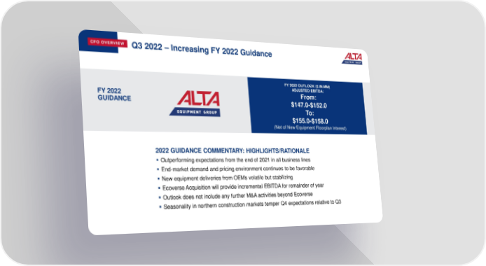 CFO OVERVIEW Q3 2022 – Increasing FY 2022 Guidance FY 2022 OUTLOOK ($ IN MM) ADJUSTED EBITDA: FY 2022 From: GUIDANCE $147.0-$152.0 To: $155.0-$158.0 (Net of New Equipment Floorplan Interest) 2022 GUIDANCE COMMENTARY: HIGHLIGHTS/RATIONALE ▪ Outperforming expectations from the end of 2021 in all business lines ▪ End-market demand and pricing environment continues to be favorable ▪ New equipment deliveries from OEMs volatile but stabilizing ▪ Ecoverse Acquisition will provide incremental EBITDA for remainder of year ▪ Outlook does not include any further M&A activities beyond Ecoverse ▪ Seasonality in northern construction markets temper Q4 expectations relative to Q3