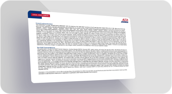 LEGAL DISCLAIMERS Forward-LookingInformation This presentation includes “forward-looking statements” within the meaning of the “safe harbor” provisions of the Private Securities Litigation Reform Act of 1995. Alta’s actual results may differ from their expectations, estimates and projections and consequently, you should not rely on these forward-looking statements as predictions of future events. Words such as “expect,” “estimate,” “project,” “budget,” “forecast,” “anticipate,” “intend,” “plan,” “may,” “will,” “could,” “should,” “believes,” “predicts,” “potential,” “continue,” and similar expressions are intended to identify such forward-looking statements. These forward-looking statements involve significant risks and uncertainties that could cause the actual results to differ materially from the expected results. Most of these factors are outside Alta’s control and are difficult to predict. Factors that may cause such differences include, but are not limited to: the impact of the COVID-19 outbreak or future epidemics on our business; federal, state, and local budget uncertainty, especially as it relates to infrastructure projects; the performance and financial viability of key suppliers, contractors, customers, and financing sources; economic, industry, business and political conditions including their effects on governmental policy and government actions that disrupt our supply chain or sales channels; our success in identifying acquisition targets and integrating acquisitions; our success in expanding into and doing business in additional markets; our ability to raise capital at favorable terms; the competitive environment for our products and services; our ability to continue to innovate and develop new business lines; our ability to attract and retain key personnel, including, but not limited to, skilled technicians; our ability to maintain our listing on The New York Stock Exchange; the impact of cyber or other security threats or other disruptions to our businesses; our ability to realize the anticipated benefits of acquisitions or divestitures, rental fleet investments or internal reorganizations; and other risks and uncertainties identified in this presentation or indicated from time to time in the section entitled “Risk Factors” in Alta’s annual report on Form 10-K and other filings with the U.S. Securities and Exchange Commission (the “SEC”). Alta cautions that the foregoing list of factors is not exclusive and readers should not place undue reliance upon any forward-looking statements, which speak only as of the date made. Alta does not undertake or accept any obligation or undertaking to release publicly any updates or revisions to any forward-looking statements to reflect any changein its expectations or any change in events, conditions or circumstances on which any such statement is based. Non-GAAP Financial Measures This presentation includes non-GAAP financial measures, including Adjusted EBITDA, Economic EBIT, organic revenue, and various free cash flow metrics. Alta believes that these non- GAAP measures are useful to investors for two principal reasons. First, Alta believes these measures may assist investors in comparing performance over various reporting periods on a consistent basis by removing from operating results the impact of items that do not reflect core operating performance. Second, these measures are used by Alta’s management to assess its performance and may (subject to the limitations described below) enable investors to compare the performance of Alta to its competition. Alta believes that the use of these non-GAAP financial measures provides an additional tool for investors to use in evaluating ongoing operating results and trends. These non-GAAP measures should not be considered in isolation from, or as an alternative to, financial measures determined in accordance with GAAP. Other companies may calculate Adjusted EBITDA, Economic EBIT, organic revenue, and free cash flow and other non-GAAP financial measures differently, and therefore Alta’s non-GAAP financial measures may not be directly comparable to similarly titled measures of other companies. With regard to our historical financial information, you can find the reconciliation of these non-GAAP financial measures to the most directly comparable GAAP measures in the Appendices at the end of this presentation. Alta is not providing a quantitative reconciliation of Non-GAAP Adjusted EBITDA guidance because certain financial information, the probable significance of which cannot be determined, is not available and cannot be reasonably estimated without unreasonable effort and expense. Specifically, Alta does not provide a reconciliation of forward-looking Non-GAAPAdjusted EBITDA to GAAP net income, due to the inherent difficulty in forecasting and quantifying certain items that are necessary for such reconciliation. Certain deductions for non-GAAP exclusions used to calculate projected GAAP net income may vary significantly based on actual events (including variations in acquired intangible asset amortization and stock compensation expense) and Alta is not able to forecast on a GAAP basis with reasonable certainty all deductions needed in order to provide a GAAP calculation of projected net income at this time. The amounts of these deductions may be material and, therefore, could result in projected GAAP net income being materially less than is indicated by projected Non-GAAP Adjusted EBITDA. Information in this presentation is not an offer to sell securities or the solicitation of an offer to buy securities, nor shall there be any sale of securities in any jurisdiction in which such offer, solicitation or sale would be unlawful prior to registration or qualification under the securities laws of such jurisdiction.