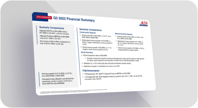 CFO OVERVIEW Q3 2022 Financial Summary Quarterly Comparisons Quarterly Comparisons Adjusted EBITDA of $44.0MM versus Construction Segment Material Handling Segment $31.6MM in Q3 2021, a 39.2% increase ▪ Revenue growth of $65.0MM, or 35.2%, from ▪ Revenue growth of $45.0MM, or 40.8%, from Adjusted Proforma EBITDA of $44.8MM $184.7MM to $249.7MM $110.3MM to $155.3MM versus $37.7MM in Q3 2021 ▪ Aftermarket revenue growth of $18.0MM, or ▪ Aftermarket revenue growth of $11.4MM, or Net income of $4.4 million compared to a 39.0%; Organic aftermarket revenue growth of 28.1%; Organic aftermarket revenue growth loss of $(0.6) million a year ago 15.8% of 17.3% ▪ Rental revenue growth of $3.4MM, or 11.7%; ▪ Rental revenue growth of $3.3MM, or 26.2%; Organic rental revenue growth of 6.5% all represented by Organic growth Rental Business ▪ Rental equipment sales of $28.6MM ▪ Seventh consecutive quarter of strong rental equipment sales activity based on high demand for lightly used equipment and illustrative of Alta’s rent-to-sell field population model ▪ Utilization up ~3.2% versus last year and rate environment remains strong ▪ Moderate increase in rental fleet size versus June 2022 TTM Performance Revenue growth of $110.0MM, or 37.3%, th 1 from $295.0MM to $405.0MM ▪ TTM September 30 2022 FY Adjusted Proforma EBITDA of $163.0MM th 1 Increased rental utilization and demand for ▪ TTM September 30 2022 Adjusted Proforma Economic EBIT of $111.7MM , for an EBITDA equipment; product support continues to conversion rate of 68.5% drive EBITDA and profitability 1 As adjusted for proforma acquisition activity (Baron acquired September 2021, Gibson acquired October 2021, Mine acquired December 2021, Ginop acquired December 2021, Ambrose acquired December 2021, and YIT acquired June 2022); metrics presented are net of interest paid on showroom-ready equipment.