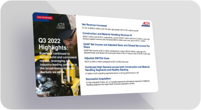 CEO OVERVIEW Net Revenue Increased 37.3% to $405.0 million over the year ago quarter with 21.8% organic growth Construction and Material Handling Revenue Of $249.7 million and $155.3, respectfully, up from $184.7 million and $110.3 million a year ago; Q3 2022 product support revenue also increased $29.4 million year-over-year to $116.1 million GAAP Net Income and Adjusted Basic and Diluted Net Income Per Highlights: Share GAAP Net income of $4.4 million compared to a loss of $(0.6) million a year ago and Business continued to adjusted basic and diluted net income per share of $0.14 versus a loss of $0.02 a year ago deliver solid and consistent Adjusted EBITDA Grew results, leveraging our 39.2% to $44.0 million compared to $31.6 million last year industry-leading position in Continued High Demand across both Construction and Material the broad-based end-user Handling Segments and Healthy Backlog markets we serve. of sales in both operating segments lead to a strong performance in Q3 Successful Acquisition of Yale Industrial Trucks, Inc. in Canada represents international expansion of Material Handling segment into major North American population centers