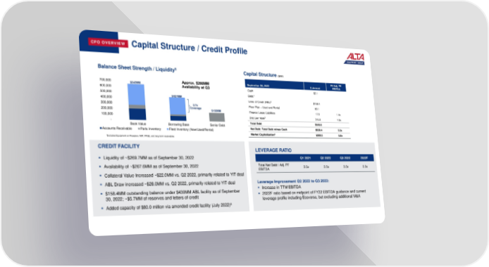 CFO OVERVIEW Capital Structure / Credit Profile Balance Sheet Strength / Liquidity5 Capital Structure ($MM) EV/Adj. PF 700,000 $642MM Approx. $268MM September 30, 2022 $ Amount EBITDA 600,000 Availability at Q3 Cash $2.1 1 500,000 $427MM Debt: 400,000 Lines of Credit (ABL)2 $158.4 300,000 2.7x Floor Plan – Used and Rental 50.1 200,000 Coverage $158MM Finance Lease Liabilities 17.0 1.4x 100,000 3 2nd Lien Note 315.0 1.9x - Total Debt $540.5 Book Value Borrowing Base Senior Debt Accounts Receivable Parts Inventory Fleet Inventory (New/Used/Rental) Net Debt: Total Debt minus Cash $538.4 3.3x 4 Market Capitalization $380.5 5.6x *Excludes Equipment on Floorplan, WIP, PP&E, and long-term receivables CREDIT FACILITY LEVERAGE RATIO ▪ Liquidity of ~$269.7MM as of September 30, 2022 Q1 2021 Q2 2022 Q3 2022 2022F ▪ Availability of ~$267.6MM as of September 30, 2022 Total Net Debt / Adj. PF 3.5x 3.5x 3.3x 3.5x EBITDA ▪ Collateral Value Increased ~$22.0MM vs. Q2 2022, primarily related to YIT deal ▪ ABL Draw increased ~$28.0MM vs. Q2 2022, primarily related to YIT deal Leverage Improvement Q2 2022 to Q3 2022: ▪ $158.4MM outstanding balance under $430MM ABL facility as of September ▪ Increase in TTM EBITDA 30, 2022; ~$5.7MM of reserves and letters of credit ▪ 2022F ratio based on midpoint of FY22 EBITDA guidance and current leverage profile including Ecoverse, but excluding additional M&A ▪ Added capacity of $80.0 million via amended credit facility (July 2022)6